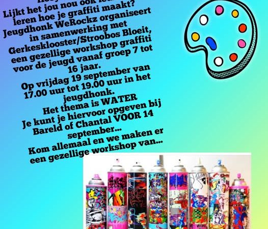 Kan popart zijn van de tekst 'Heey nou ook allemaal... leuk om Lijkt het jou je graffiti organiseert maakt? Jeugdhonk Gerkesklooster/Stroobos in amenwerking met Bloeit, leren hoe WeRockz graffiti tot een gezellige workshop groep 7 voor de jeugd vanaf 16 van vrijdag tot 19.00 uur 19 jaar. september in het Op 17.00 uur jeugdhonk. WATER opgeven 14 bij Het thema is Je Bareld of kunt je hiervoor Chantal VOOR september... en we maken er allemaal een Kom gezellige workshop van...'